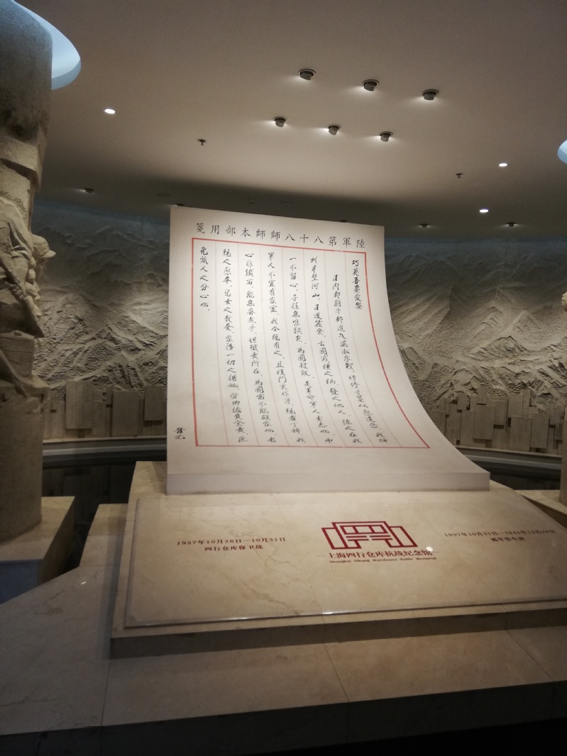 下午三时,全体成员到达四行仓库纪念馆。一进场馆就看到了一封家书,同时也是一封遗书。这是谢晋元团长写给妻子的,表达了自己对誓死为国杀敌的决心,展现出当时战士们视死如归的英雄气概。