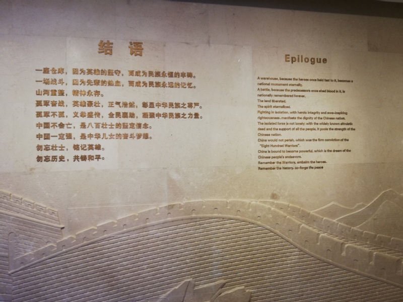 场馆中最后结语部分写出了大家的心声。“一座仓库,因为英雄的坚守,而成为民族永恒的丰碑。一场战斗,因为先辈的热血,而成为民族永远的记忆。……中国不会亡,是八百战士的坚定信念。中国一定强,是中华儿女的奋斗梦想。……”